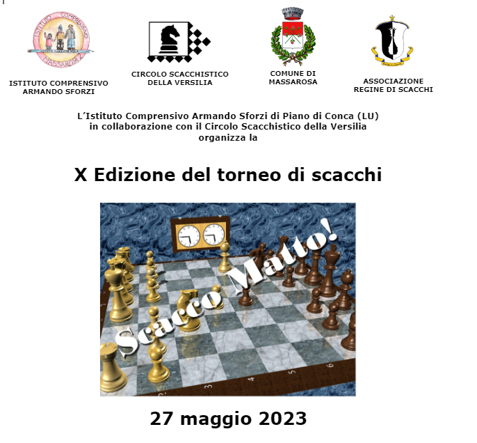 Il 27 maggio 2023 a Villa Gori a Stiava si è disputata la decima edizione del Torneo Scacco Matto, con la collaborazione del Circolo Scacchistico della Versilia, il Comune di Massarosa e l’Associazione Regine di Scacchi. Edizione con 80 iscritti tra ragazzi della scuola primaria e media, giovani delle superiori e adulti, provenienti da tutta la provincia di Lucca.